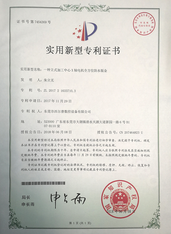 一種(zhong)立式加(jia)工中心(xīn)X軸電機(jī)全方位(wèi)防水钣(bǎn)金證書(shū)